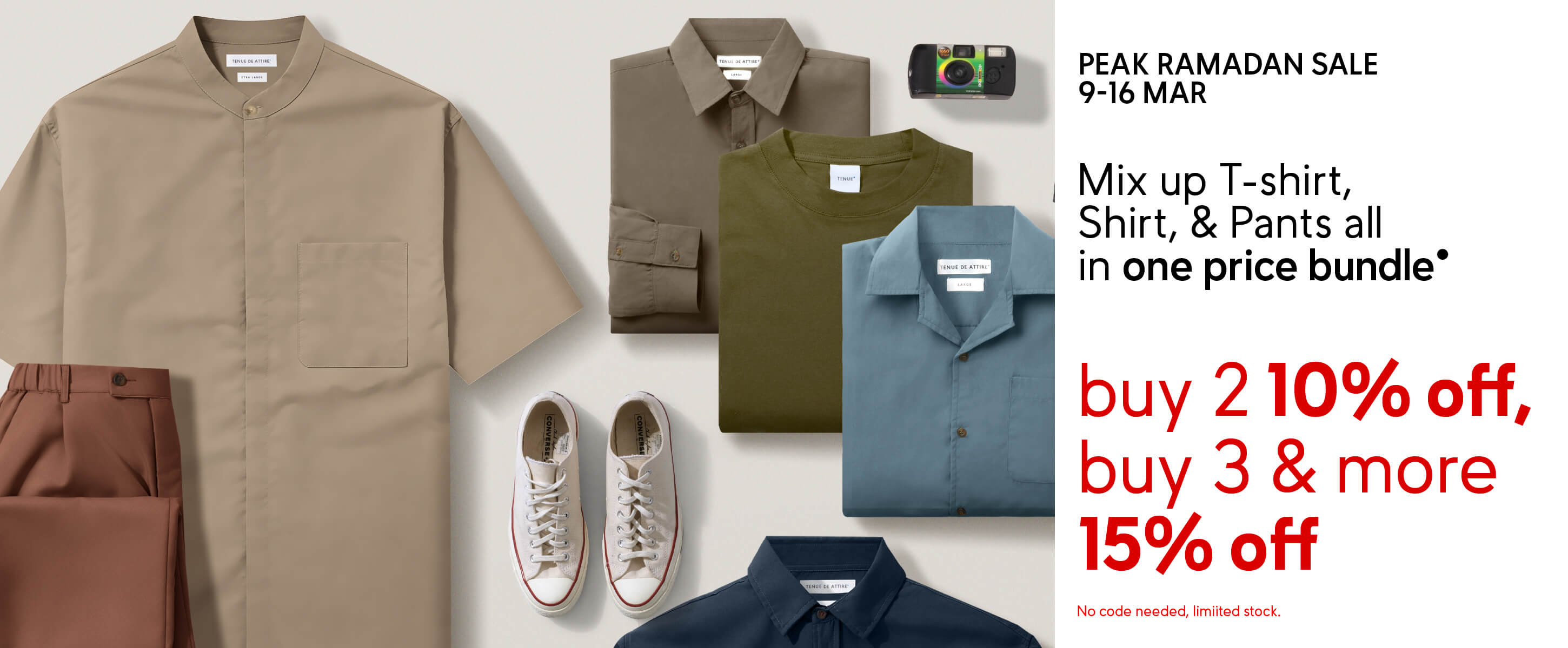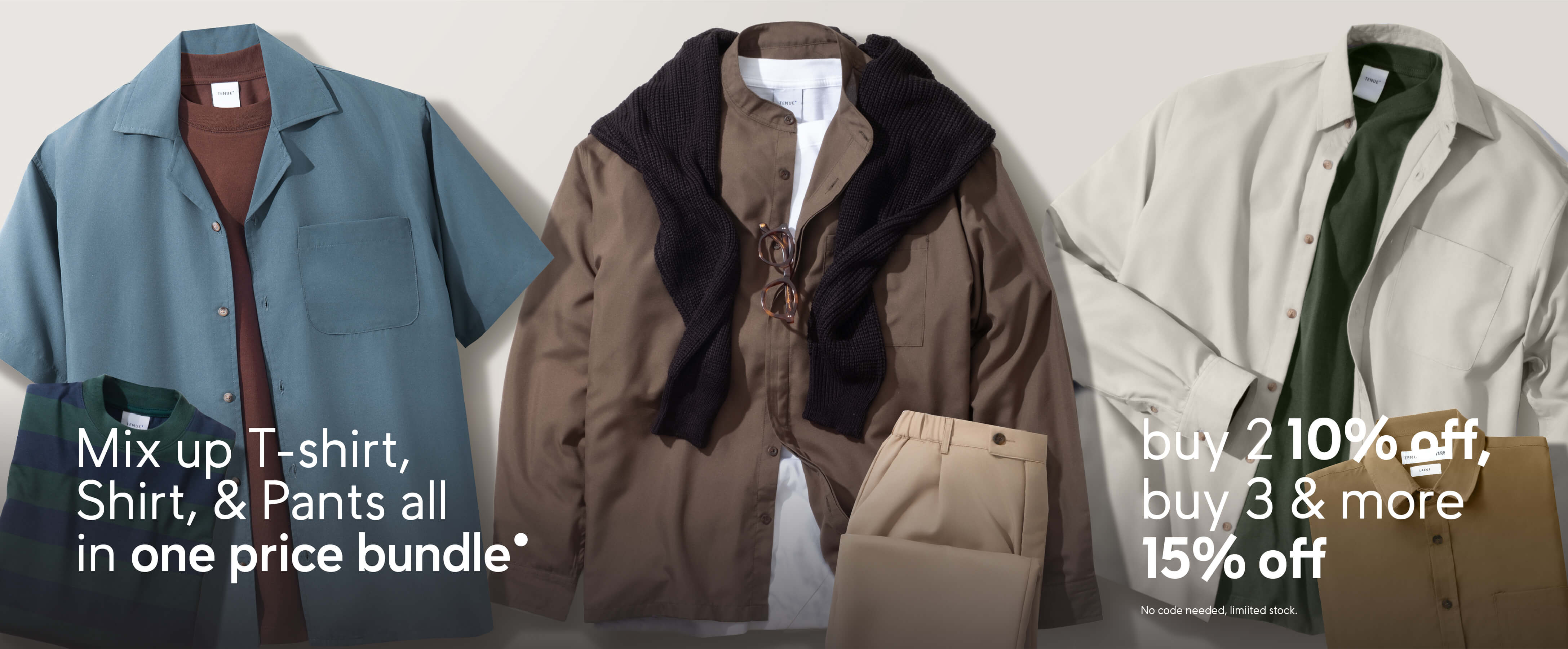 Combine the Crema Shirt, Tees, and Pants into one bundle and save up to 15%